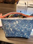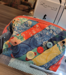 It is all about the details with this bag: playful patchwork, cute cover button zipper tabs, and a handy internal wire frame that allows the mouth of the bag to open wide. This adorable carryall is perfect for storing cosmetics, sewing supplies and more! Finished size is 8" wide x 6.25" tall x 4.75" deep (20 cm wide x 16 cm tall x 12 cm deep).